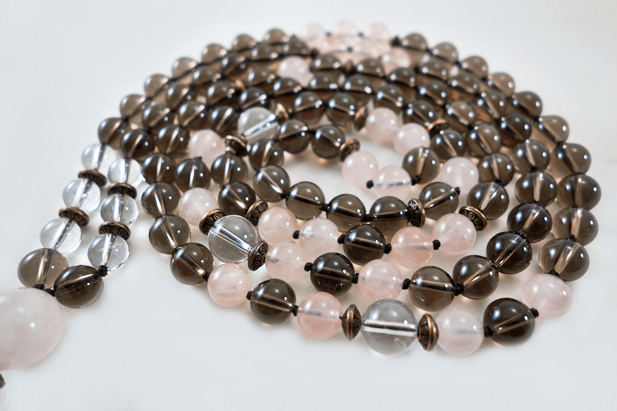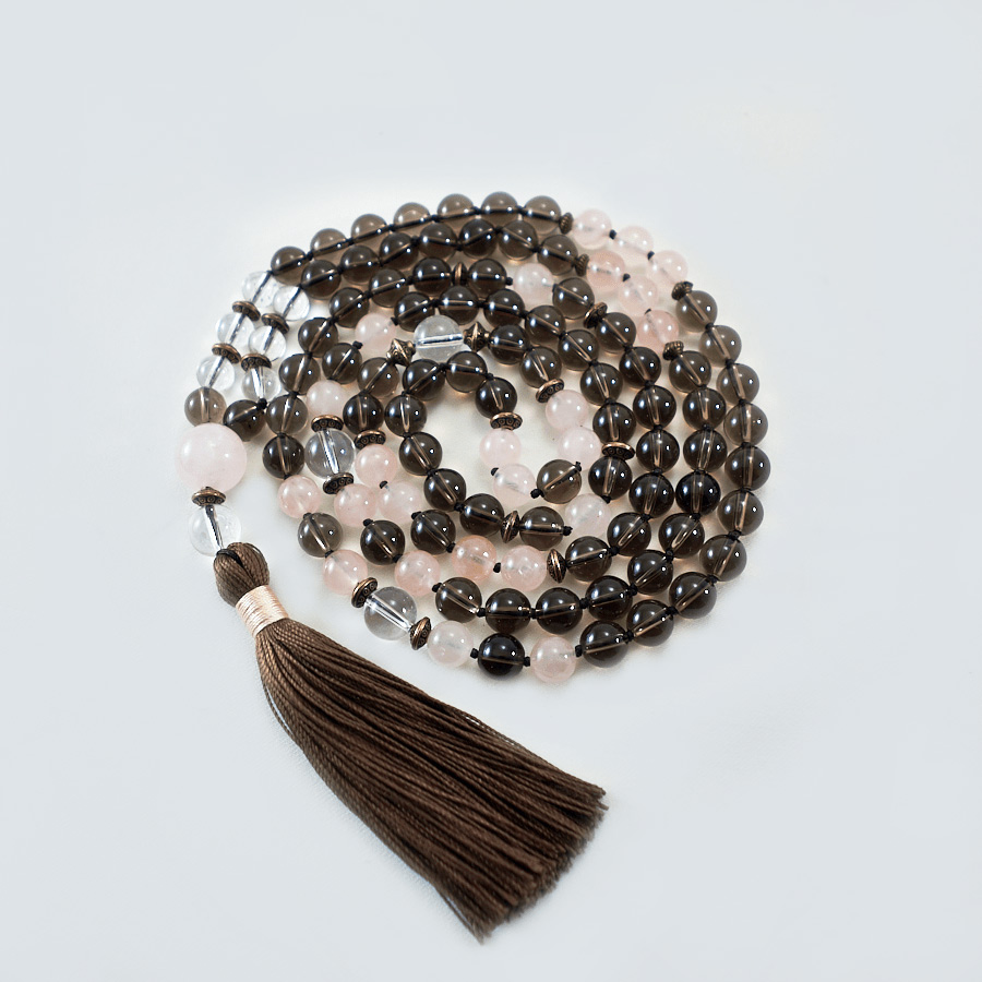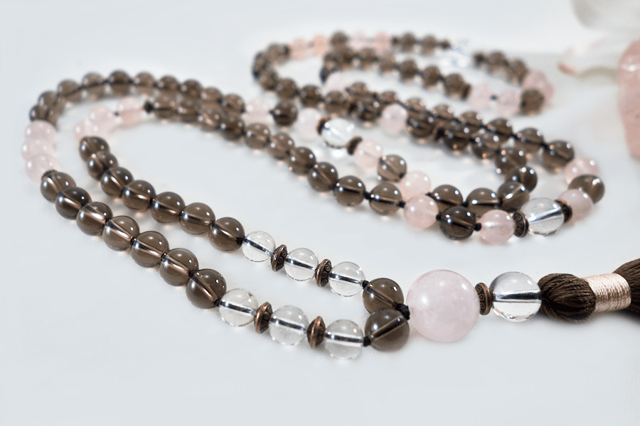 Knotted Smokey Quartz Mala Necklace with Rose and Clear Quartz
