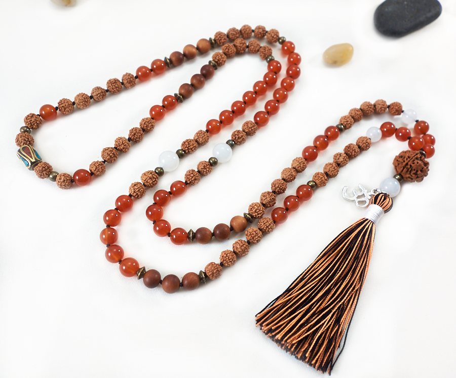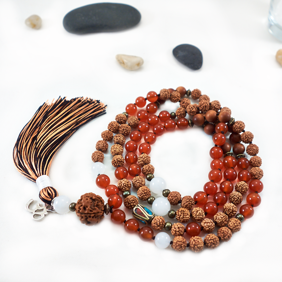 - Bead Type: Rudraksha, Carnelian, White Jade