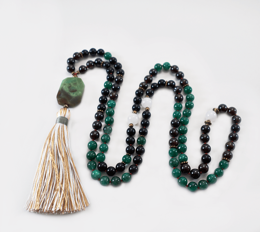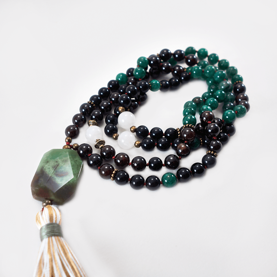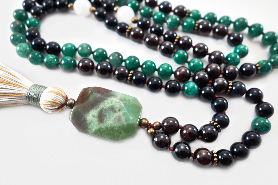 Knotted AA Green Aventurine, Garnet & Onyx Mala Necklace