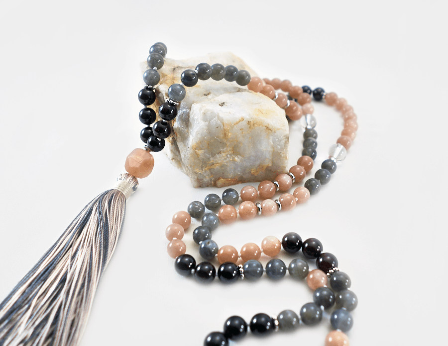 Knotted Sunstone, Labradorite & Garnet Mala Necklace